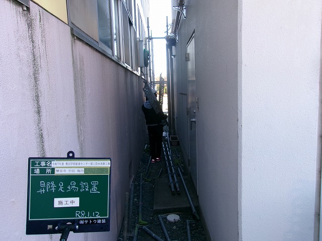 年明けから仮設足場設置を行いました。今回は昇降足場で、建物の一部分のみです。